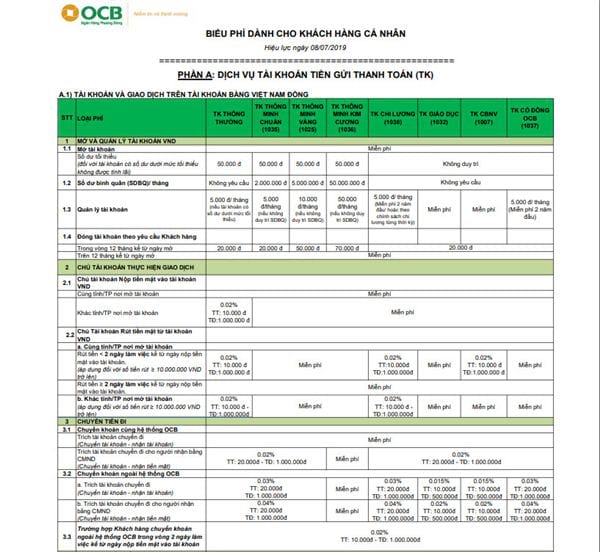Phí mở và quản lý tài khoản ngân hàng OCB